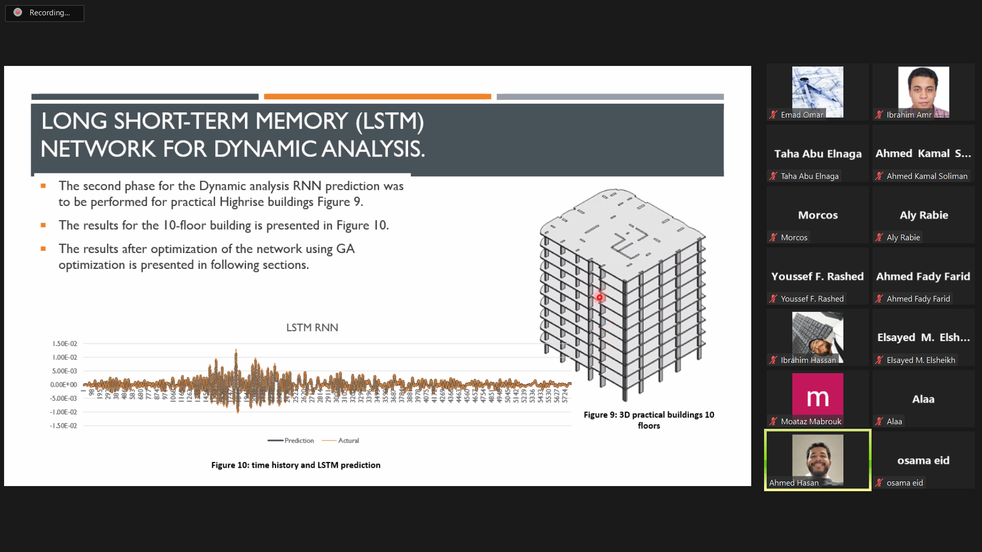 | 22:00 - 22:30 | Eng. Ahmed Mahmoud | A decoupling approach for Highrise buildings seismic response prediction using RNN and LSTM |